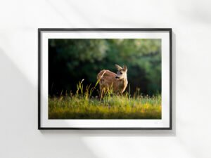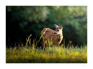 Le soleil décline sur la campagne, la famille de chevreuil sort des bois et s’aventure dans la clairière. Le jeune faon s’approche de moi, et reste là pendant de longues minutes.