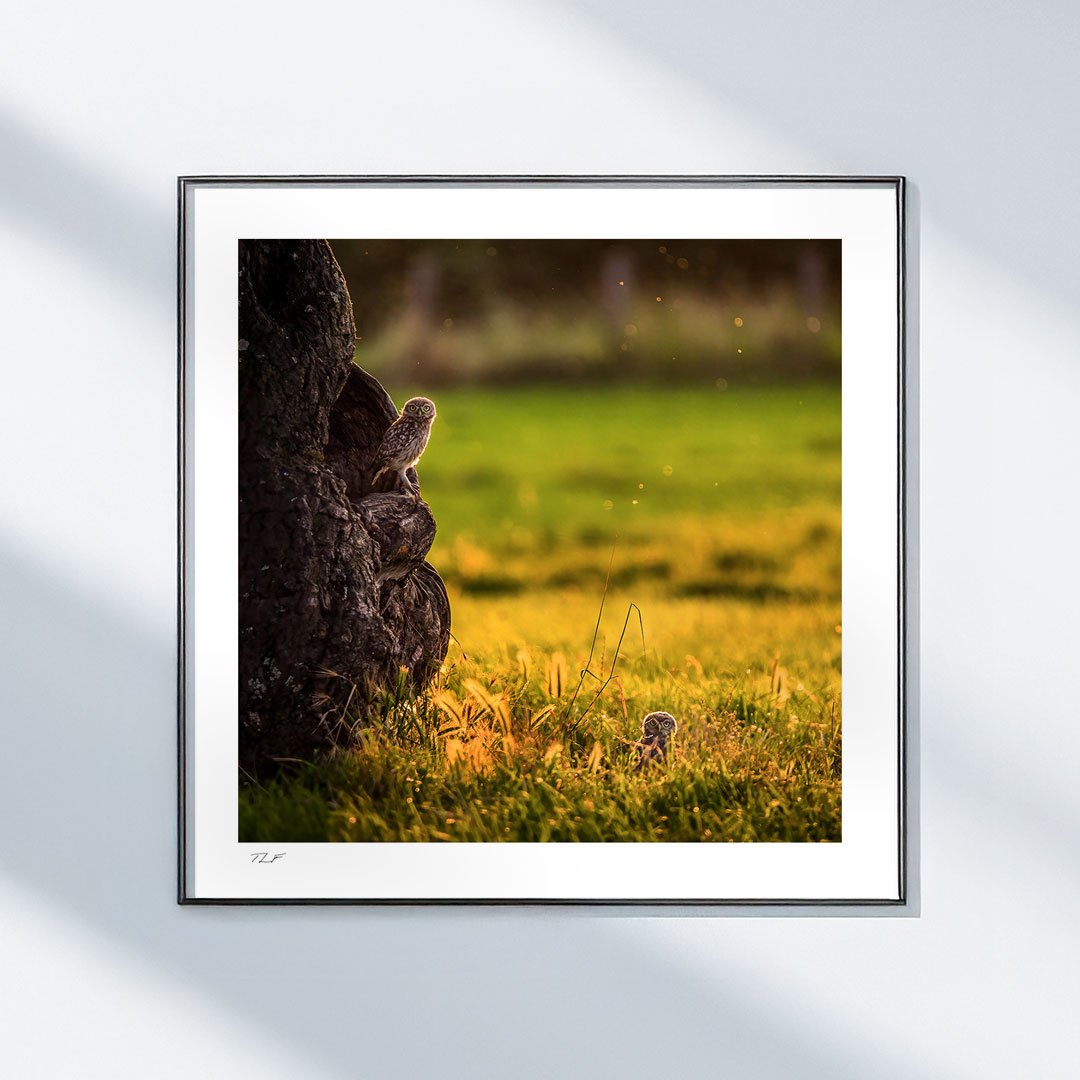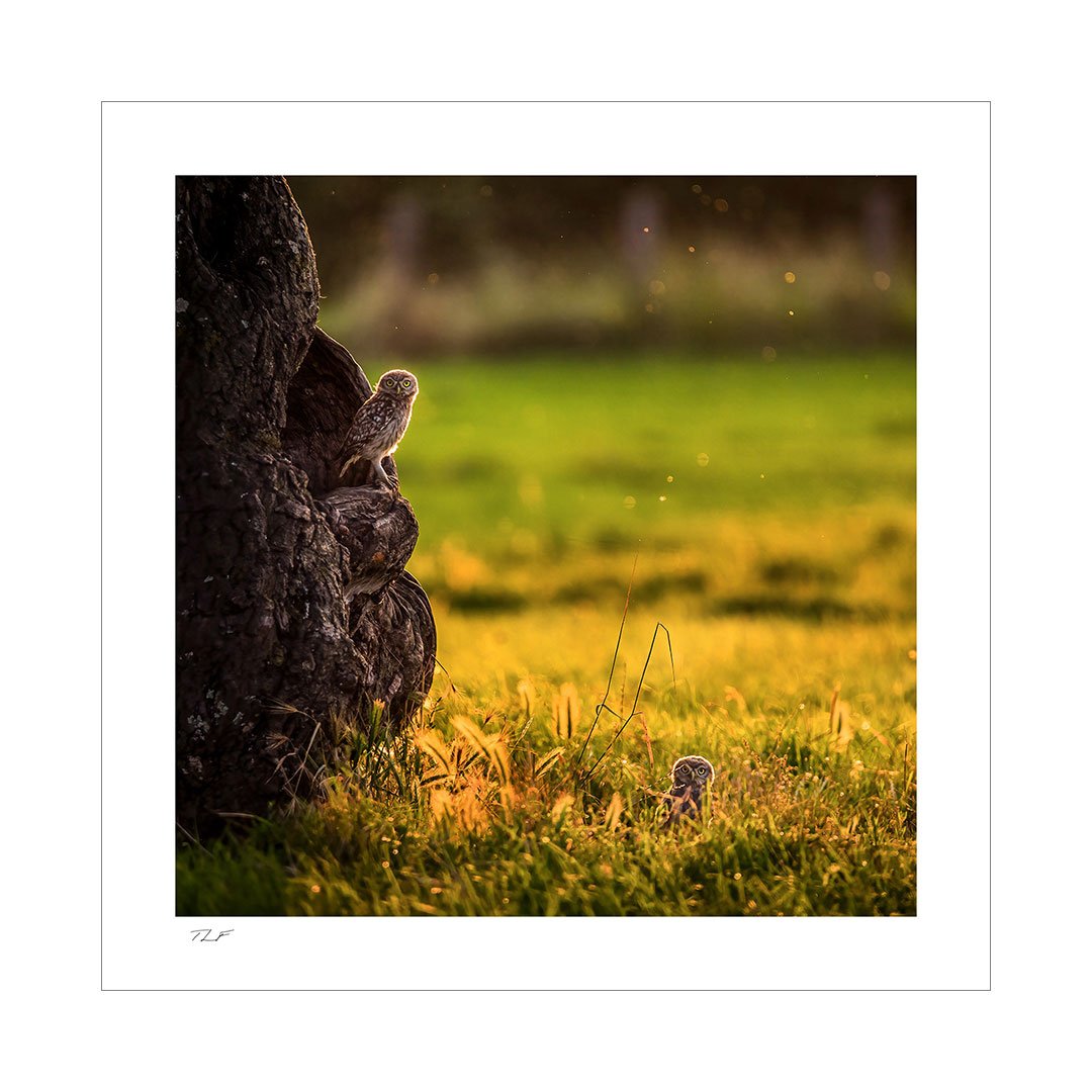 La chouette chevêche d’Athéna niche dans de vieux arbres : les deux chouettons quittent le nid, ils vont gambader dans le champs, et se cacher dans des haies alentours avant la tombée de la nuit.