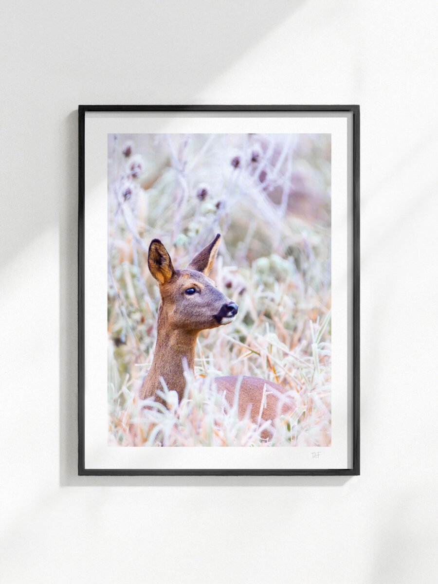 Une matinée d’hiver en campagne, à la recherche des chevreuils : la chevrette sort des broussailles givrées à quelques mètres de moi.