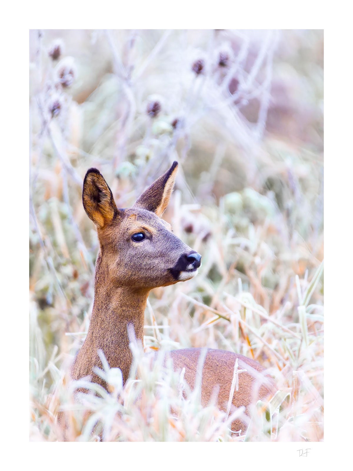 Une matinée d’hiver en campagne, à la recherche des chevreuils : la chevrette sort des broussailles givrées à quelques mètres de moi.