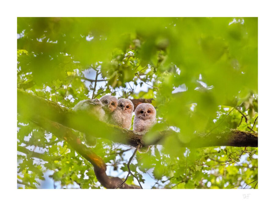 Le printemps bat son plein à la campagne, et lorsque le soleil se couche, je pars dans les bois à la recherche de la chouette hulotte. Je finis par entendre des chuintements au loin : une brochette de chouettons est en train de m’observer.
