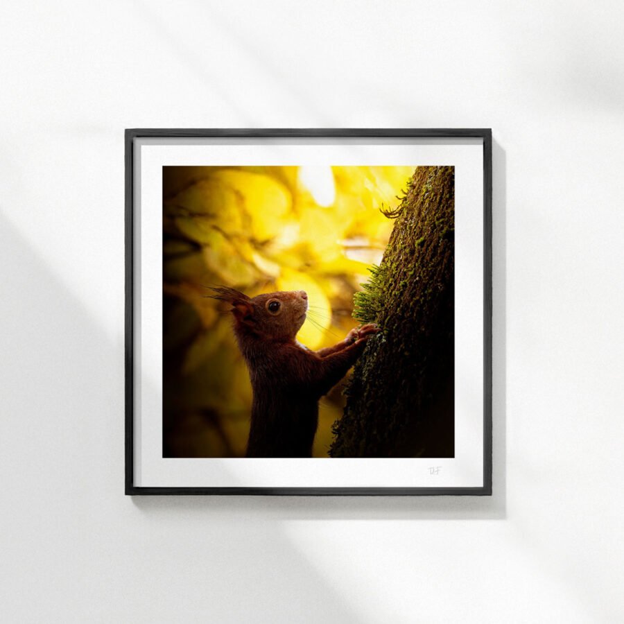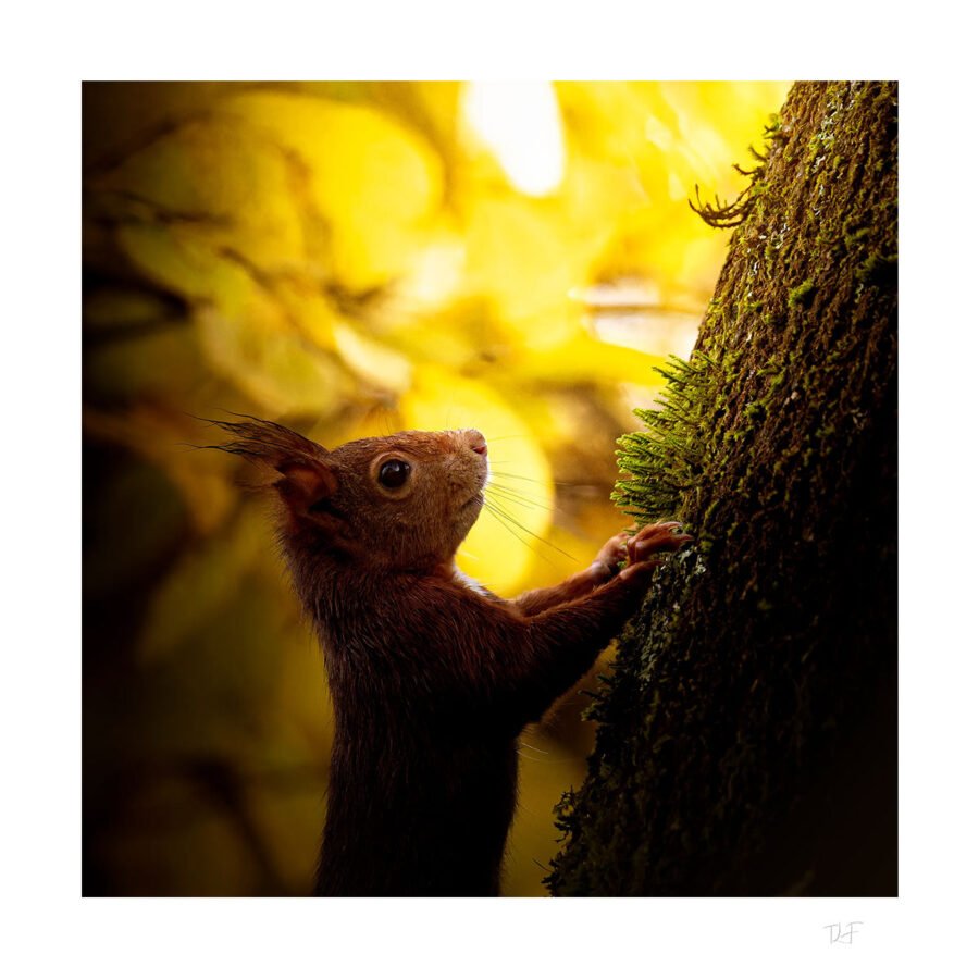 Au petit matin dans les bois, l’écureuil finit par se montrer, et passe dans un puit de lumière.
