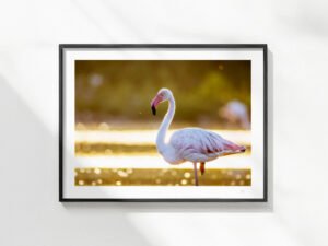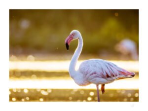 Une soirée d’été dans les marais de Camargue. Le flamant rose se promène à quelques mètres de moi, et les lumières dorées offrent un magnifique spectacle.