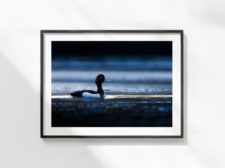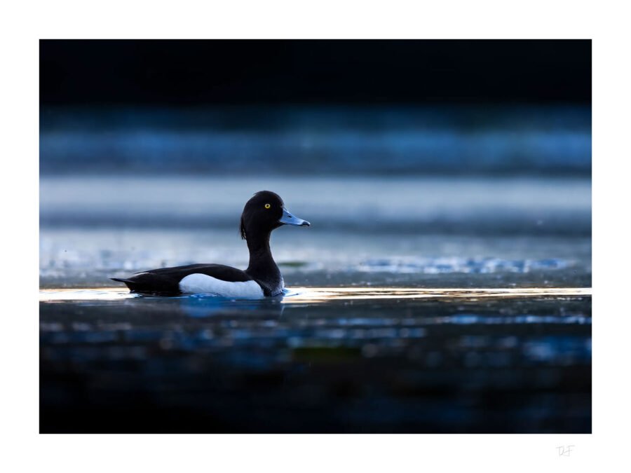La nuit tombe sur l’étang au cœur des bois, il ne me reste plus longtemps avant que la luminosité ne soit trop faible. Et c’est à ce moment là que vient se poser le fuligule morillon : un élégant canard à l’œil doré et au plumage contrasté.