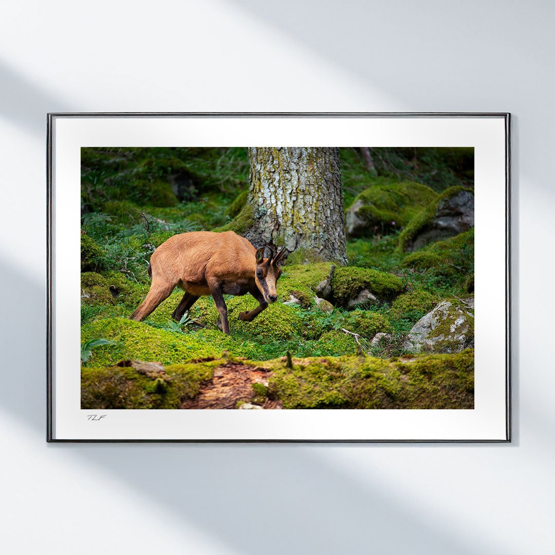 La nuit commence à tomber sur les Pyrénées. Je me trouve dans une forêt d’altitude quand je croise un isard dans les sous-bois moussus.