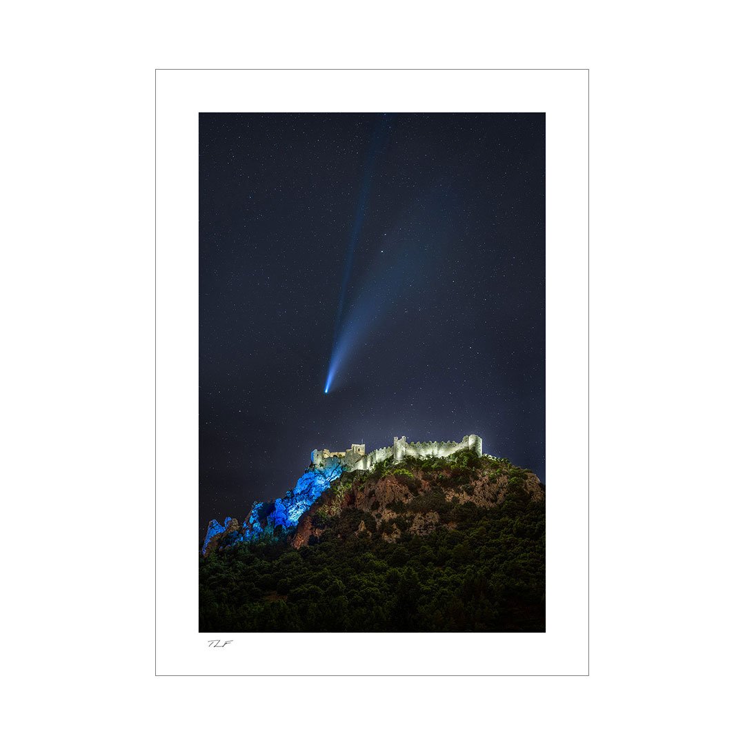 La splendide comète Neowise, immense dans le ciel, et visible à l’œil nu. En 2020 elle fait un passage remarquable dans le ciel au dessus du château de Puylaurens.