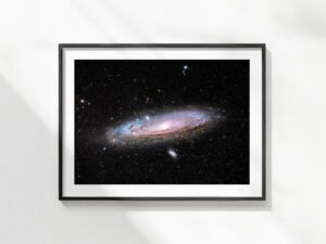 L’immense galaxie d’Andromède, visible à l’œil nu sous un ciel bien sombre. Elle est six fois plus grande que la Lune dans le ciel, mais bien moins lumineuse.