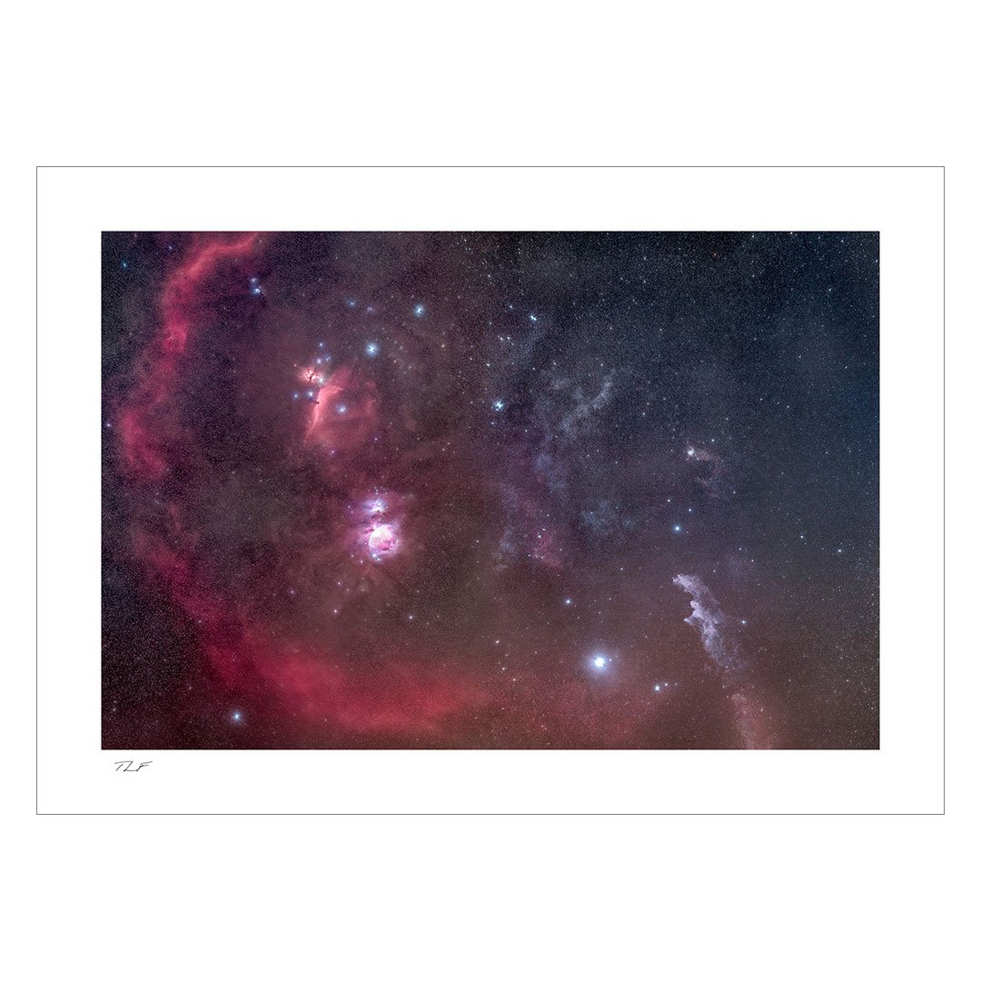 La constellation d’Orion sous toute sa splendeur. On peut y voir l’étoile Rigel (en bas) et les trois étoiles de la ceinture d’Orion (en haut). Elles sont entourées des superbes nébuleuses d’Orion : la tête de sorcière (en bas à droite), la grande nébuleuse (au centre) et la tête de cheval (haut droit).