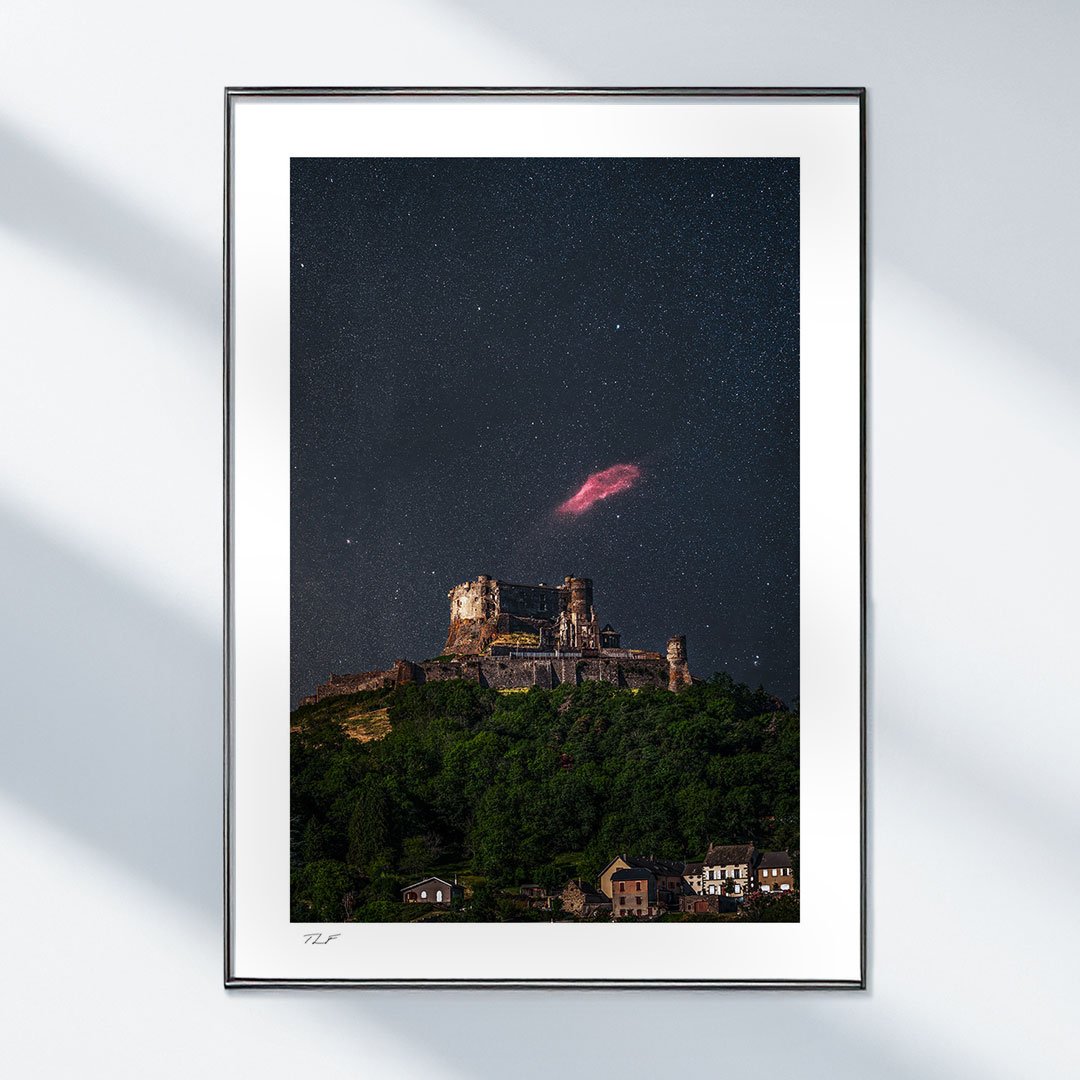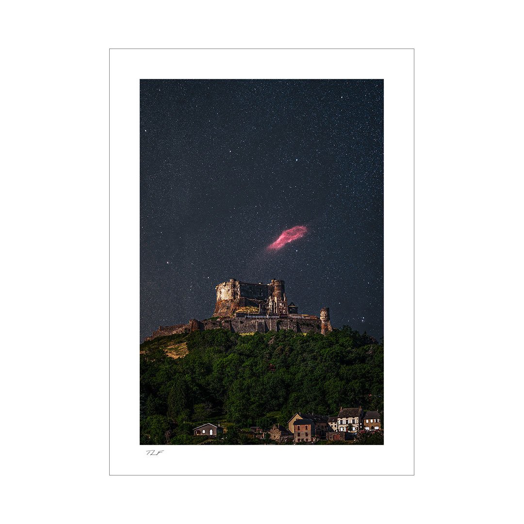 Nébuleuse et château : la gigantesque nébuleuse de la Californie, au dessus du château de Murol.