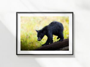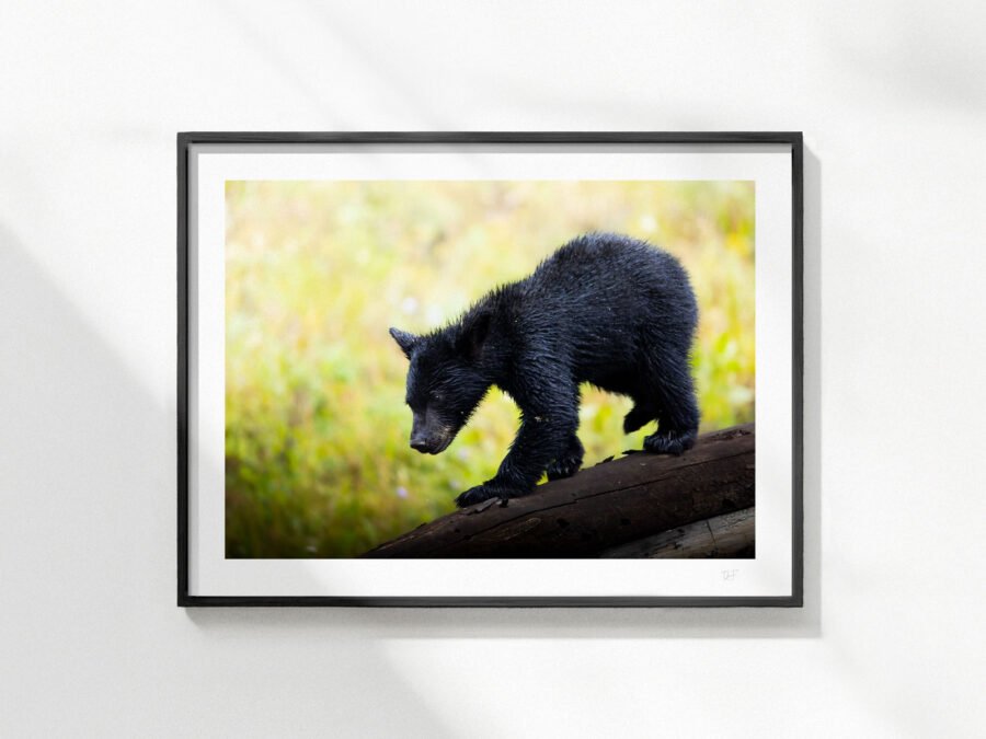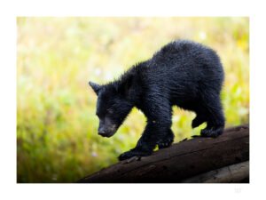Crépuscule à Yellowstone, au cœur des collines, un ourson noir apparaît, il suit sa mère à la recherche de baies.