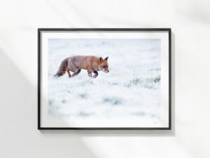 À l’aube, un instant furtif dans un champ au cœur de l’hiver : le renard roux retourne se cacher dans les bois après une nuit de chasse dans le froid.