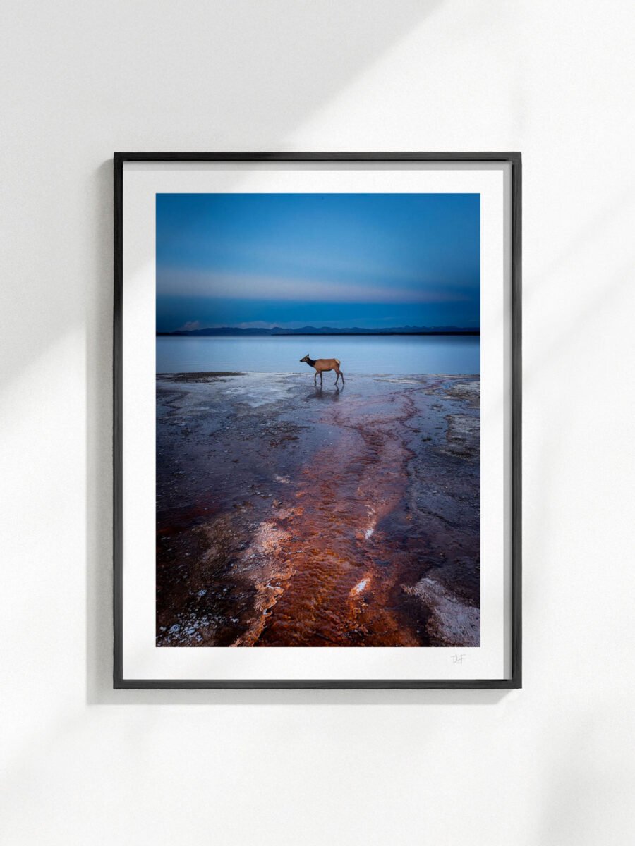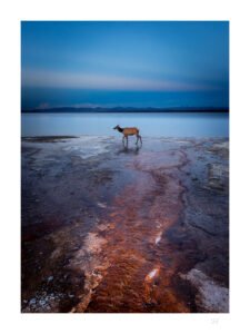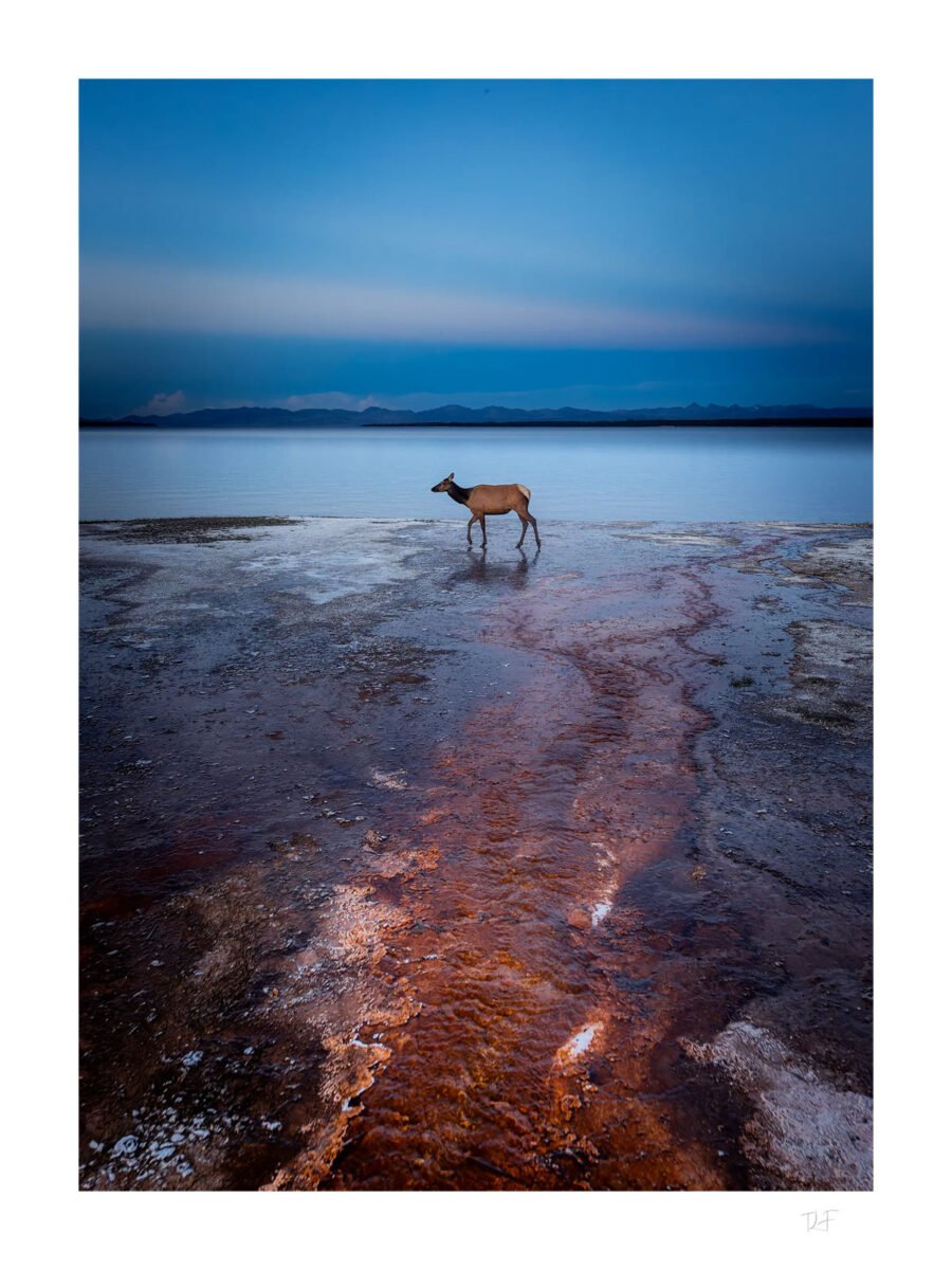 À la tombée de la nuit, un wapiti sort des bois pour s’aventurer sur les berges du lac Yellowstone, il passe non loin des sources chaudes et geysers qui transforment les paysage.